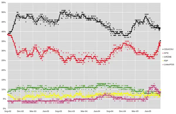 Early election polls during summer 2005 from 6 organizations showed a solid lead for the CDU/CSU with a share of the vote ranging between 41% and 43%, and the SPD trailing at between 32% and 34%.[9] The polls further showed the FDP, a possible coalition partner for the conservatives, at between 6.5% and 8%, and the Greens, the current coalition partner for the SPD, between 6% and 8%. Most polls indicated a likely majority for a CDU/CSU-FDP coalition. As for other parties, those polls which explicitly included the PDS-WASG electoral alliance showed it above the 5% hurdle at between 7% and 8.5%. No poll showed any other parties, including far-right parties, near 5%, although far-right parties have in the past sometimes polled below their actual support due to unwillingness by voters to admit their support.