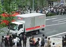 On 8 June 2008, Tomohiro Katō drove a five-ton, rented Isuzu Elf truck into a crowd at the crossing of Kanda Myōjin-dōri and Chūō-dōri streets in Akihabara, Chiyoda, Tokyo.[11][12] While Kanda Myōjin-dōri was open to vehicular traffic, Chūō-dōri was closed for the convenience of shopping pedestrians,[11] a practice observed every Sunday and during holidays.[13] At 12:33, Katō hit five people with the truck after ignoring a red light.[14][15] As some people gathered to care for the victims,[16] Katō climbed out of the truck and stabbed at least twelve people with a dagger, according to a witness, while screaming.[17][18] Police chased Katō and cornered him in a narrow alley, and a police officer pointed a gun at him; he dropped his knife and was held down by the police at 12:35 about 170 meters (600 ft) away from the truck.[11][14]