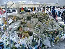According to police and hospital officials, six of the seven victims who were killed were men, including Kazunori Fujino and his friend Takahiro Kamaguchi (both 19), Katsuhiko Nakamura (74), Naoki Miyamoto (31), Mitsuru Matsui (33), and Kazuhiro Koiwa (47). One woman, Mai Mutō (21), was also killed.[21] Communication records showed that Mutō probably made an emergency call to police from her mobile phone, though she left no message.[22] Later that day, a makeshift memorial was created by the public.[23][24]