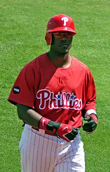Though several fill-in players, including Brad Harman and T. J. Bohn, substituted during Victorino's and Rollins' absence, none was more valuable to the team during May than Jayson Werth. Expected to be primarily a platoon player coming into the season, Werth showed positive form. While Utley slowed down, Werth had a game with three home runs[25] and stole four bases in the month.[26] However, as Rollins and Victorino returned, Werth was lost to the disabled list.[27] Ryan Howard broke out of his early-season slump, batting .245 in May, nearly an 80-point increase from his average in April, and hitting ten home runs.[28] Hometown pitcher Jamie Moyer also became the sixth pitcher in Major League Baseball history to defeat all 30 teams in the league on May 26 in a 20–5 Phillies win over Colorado.[29]