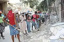 Slow distribution of resources in the days after the earthquake resulted in sporadic violence, with looting reported.[98] There were also accounts of looters wounded or killed by vigilantes and neighbourhoods that had constructed their own roadblock barricades.[99][100] Dr Evan Lyon of Partners in Health, working at the General Hospital in Port-au-Prince, claimed that misinformation and overblown reports of violence had hampered the delivery of aid and medical services.[101][102]