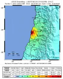 - "Magnitude 6.9 – LIBERTADOR O'HIGGINS, CHILE". United States Geological Survey. 11 March 2010. Archived from the original on 13 February 2013. Retrieved 2 September 2010.