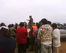 A Pacific-wide tsunami warning was not issued by the Pacific Tsunami Warning Center, although the organization pointed out the possibility of local tsunamis within 100 kilometres (62 mi) of the epicentre, roughly the area between La Serena and Concepción.[32] Half an hour after the first earthquake, the Hydrographic and Oceanographic Service of the Chilean Navy (Servicio Hidrográfico y Oceanográfico de la Armada, SHOA) issued a tsunami warning for the area between Coquimbo and Los Lagos regions, as a way of "keeping people protected" against the possible occurrence of new tsunamis.[17][33][34] President Piñera urged coastal residents to move to higher ground in case of a tsunami.[34] Following the tsunami alert, thousands of residents of central Pichilemu fled to La Cruz Hill, with some of them staying there for several days,[35][36] and received advice from members of the Army.[37] People from the village of Cáhuil stayed at Cordón.[38] The tsunami warning emitted by SHOA was lifted that same day at around 15:50 local time.[39]