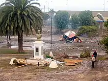 At Pichilemu, the epicentre town, the earthquakes destroyed the balustres surrounding Agustín Ross Park, damaged severely the recently re-inaugurated Agustín Ross Cultural Centre, and the Espinillo, and Rodeillo villages.[38][44] The earthquake was accompanied by "great noise", according to witnesses from the Pichilemu villages of Cardonal de Panilonco and La Aguada;[17] most of the already damaged buildings in La Aguada fell down, including the local church. The road to Cardonal de Panilonco was damaged, and many houses built with adobe did not resist the shaking.[45]