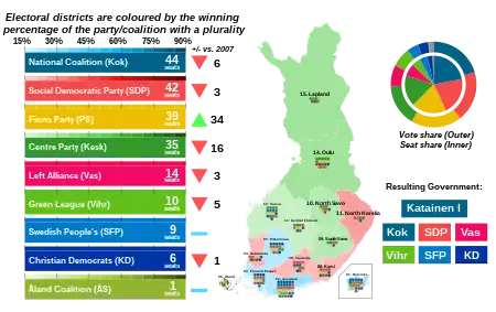 The election resulted in a breakthrough for the populist True Finns, which came head-to-head with the three big parties, while every other parliamentary party in mainland Finland, excluding Åland, lost popularity. The National Coalition Party (NCP) also ended up as the biggest party for the first time in its history.[4] The total turnout rose to 70.5% from 67.9% in the previous election; and corruption scandals also resulted in an anti-incumbency vote. The incumbent, Centre Party-led coalition, which included the NCP, Green League and Swedish People's Party (SPP), lost its majority by two seats and their Prime Minister Mari Kiviniemi of the Centre Party signaled that her party would then sit in opposition.