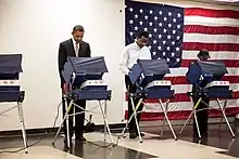 In 2011, several state legislatures passed new voting laws, especially pertaining to voter identification, with the stated purpose of combating voter fraud; the laws were attacked, however, by the Democratic Party as attempts to suppress voting among its supporters and to improve the Republican Party's presidential prospects. Florida, Georgia, Ohio,[6] Tennessee, and West Virginia's state legislatures approved measures to shorten early voting periods. Florida and Iowa barred all felons from voting. Kansas, South Carolina,[7] Tennessee, Texas,[8] and Wisconsin[9] state legislatures passed laws requiring voters to have government-issued IDs before they could cast their ballots. This meant, typically, that people without driver's licenses or passports had to gain new forms of ID. Former President Bill Clinton denounced them, saying, "There has never been in my lifetime, since we got rid of the poll tax and all the Jim Crow burdens on voting, the determined effort to limit the franchise that we see today".[10] He was referring to Jim Crow laws passed in southern states near the turn of the twentieth century that disenfranchised most blacks from voting and excluded them from the political process for more than six decades. Clinton said the moves would effectively disenfranchise core voter blocs that trend liberal, including college students, Blacks, and Latinos.[11][12] The Obama campaign fought against the Ohio law, pushing for a petition and statewide referendum to repeal it in time for the 2012 election.[13]
