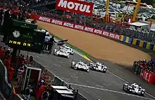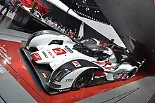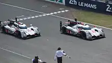 The No. 2 Audi, driven by Fässler, Benoît Tréluyer, and Lotterer, was able to maintain the race lead without trouble for the final two hours of the race, taking the trio's third race win in four years, and Audi's thirteenth overall. Porsche was able to repair the No. 14 car enough to return it to the track for the final lap, settling for eleventh place overall.[67] The battle in LMP2 continued into the last hour, as the Jota Zytek was able to overhaul the TDS Ligier and hold on for the class win and fifth place overall. The win was the first for Jota Sport and its drivers Dolan, Turvey, and Tincknell.[68] Nissan powered the top five finishers in the class. In the LMGTE Pro category, the No. 73 Corvette was able to come back against the No. 92 Porsche to claim second in class, but no one was able to challenge the lead of the AF Corse Ferrari for the remainder of the race. The No. 95 Aston Martin, which had been Allan Simonsen's entry when he was killed in an accident at Le Mans the previous year, was undaunted in LMGTE Am and maintained the first-place position it had held for 205 consecutive laps. Proton Competition came in second in the class, two laps adrift of the Aston Martin.[69] There were eight lead changes in the race; four cars reached the front of the field. The No. 7 Toyota led three times for a total of 207 laps, more than any other car. The No. 2 Audi led twice in the race for a total of 73 laps.[70]