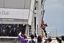 Alonso told the press he expected to lose the battle with Vettel because his car's rear-wing aerodynamic deficiencies led it to not operate correctly, and Ferrari contemplated retiring him. "Vettel overtook me by going out of the track. He finished in front, but I was very proud of my 13 laps. If he had not passed me on the lap he did it would have been the next one because we were in slow motion and they were at real speed."[53] Vettel described a series of radio transmissions where he complained of a series of suspected illegal manoeuvres such as driving off the track during his duel as "silly"; "I got the message that I should respect the limits and that he was complaining, so I was doing the same thing. I'm not sure who won the list-keeping. I think twice it was maybe a bit too harsh into Turn 6 [Brooklands], but it was good to get the move at the end."[53] Nevertheless, former driver Allan McNish said on a BBC Sport online column the battle was "some of the best racing you will ever see" and it demonstrated "two world champions having to really work for their living."[54] Gutierrez was found to be "predominantly at fault" for his collision at Club corner on lap line, and incurred a five-place grid penalty for the following German Grand Prix and three penalty points on his super licence.[55]