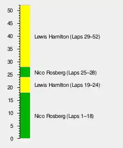 By the 14th lap Bottas had caught Magnussen, and entering Stowe corner used his DRS and better speed to pass him on the outside for fourth.[40] Alonso overtook Magnussen around the outside of Stowe corner for fifth as Ricciardo made a pit stop for the soft compound tyres on lap 15.[41] Two laps later, Bottas passed Button at Stowe turn for third.[37][39] On that lap, Ricciardo passed Sutil on the approach to Stowe corner for ninth.[41] Rosberg made his first pit stop from the lead on the 18th lap. Hamilton led for six laps; the plan was for him to run the middle stint on the hard-compound tyres before his own stop at the conclusion of lap 24.[40] In the meantime, Rosberg began developing gearbox problems on lap 20.[46] As Alonso battled with Button, a stone lodged in his rear wing slot gap that remained there for the rest of the Grand Prix. He twice oversteered coming through Becketts corner as Ricciardo passed Hülkenberg for eighth. Rosberg had increased his advantage over Hamilton, whose pit stop lasted 1.7 seconds than expected as his hard-compound left-rear wheel was slow to install at his pit box, to six seconds.[39][40]