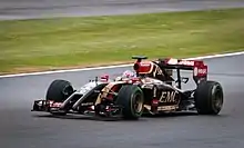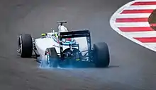 Hamilton used soft compound tyres to record the fastest lap of the second session with an early time of 1 minute, 35.508 seconds; his running was curtailed because his engine cut out with 1⁄2 an hour to go. Rosberg, Alonso, the Red Bull pair of Ricciardo and Vettel, Bottas, Button, Magunssen, Räikkönen and Vergne rounded out the top ten.[19] A localised explosion tore through the left-hand side of Bottas' engine cover and loosened it with five minutes to go. Vergne's left-front wheel detached at Abbey corner and he had to stop at the side of the track.[19][20] On Saturday morning, FIA race director Charlie Whiting adopted a "zero tolerance policy" and cautioned drivers not to run wide leaving Copse and Club without being forced or their lap times would be deleted in a bid to enforce stricter regulations on driving off the track.[21] Overnight rain made the track wet and a north-westerly wind was a factor in the final session; four drivers chose not to set a timed lap and some went off the slippery track.[22][23] Vettel set the fastest lap of 1 minute, 52.522 seconds, with his teammate Ricciardo second. Pastor Maldonado, Romain Grosjean, Sutil, Kvyat, Magnussen, Button, Bottas and Räikkönen completed the top ten.[24] Jules Bianchi broke his front wing in an impact with the barrier at Stowe corner. Sutil also avoided hitting the wall at Stowe turn and exited the corner's gravel trap.[24]
