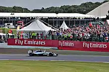 The 2014 British Grand Prix was the 9th of the 19 races in the 2014 FIA Formula One World Championship and the 65th edition of the event as a round of the World Championship. It was held at the 18-turn 5.891 km (3.660 mi) Silverstone Circuit in Silverstone, Northamptonshire, England on 6 July.[4] Tyre supplier Pirelli brought a white-banded Medium and orange-banded Hard dry-compounds to the race as well as two wet-weather compounds, the intermediate and full wet tyres.[2] The drag reduction system (DRS), an adjustable flap at the back of each car that helps with overtaking when activated, had two activation zones for the race: one on the Wellington Straight linking the Arena and Brookands turns, and one on the Hangar Straight between Chapel and Stowe corners.[5] After the 2013 race, artificial grass was removed at the exits at three corner, the inside side barrier at the entrance to Brooklands corner was enlargened, and circuit drainage was improved.[4]