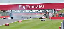On lap eight, Alonso used DRS to pass Hülkenberg on the outside at Brooklands turn after a short battle.[39][40][41] Further back Sutil passed Bianchi for eleventh as Ricciardo battled Hülkenberg for eighth at Luffield turn on lap ten but could not pass due to the latter's higher straight-line speed. Ricciardo tried again into Stowe corner and succeeded.[41] On the inside at Club turn on the same lap, Gutiérrez attempted to pass Maldonado, who sought to overtake Bianchi. Gutiérrez hit Maldonado's left-hand side; contact continued through the corner and Maldonado was launched airborne off Gutiérrez's right-front tyre. Gutiérrez got beached in a gravel trap and retired with rear car damage.[39][41] The first pit stops for tyres occurred on lap 11 as Vettel entered the pit lane to try and pass the McLarens; the faster Bottas, behind him, was thus freed to try to catch Magnussen.[39][40] On the next lap, Ericsson's suspension failed on the Brooklands corner kerb and he drove to the pit lane to retire.[37][46] Alonso incurred a five-second stop-and-go penalty on the 13th lap because he was deemed to have been out of position on his grid slot for the restart.[41]