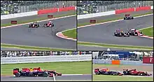 Vettel immediately made a second pit stop at the end of the lap. He rejoined ahead of Alonso in fifth place.[41] Alonso twice passed Vettel around the outside at Copse corner during a duel for fifth between laps 35 and 36.[39][40] On lap 37, Vettel had optimum tyre temperature,[41] and used DRS on the Wellington Straight to pass Alonso on the outside under braking. Alonso then went across the front of Vettel leaving Brooklands corner to retain fifth.[40] Vettel saw space to pass Alonso at Brooklands corner on lap 42, but the latter blocked his pass on the racing line.[37] Three laps later, Vettel turned to the outside of Luffield corner. Although he did not pass Alonso, Vettel entered the straight faster than the former who reacted by turning to the inside past the former Grand Prix pit lane to block him.[40] On the 47th lap, Vettel turned to the outside at Brooklands corner to draw alongside Alonso through Woodcote turn but Alonso kept fifth by braking later than him.[39][41]