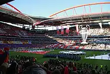 The ceremony preceding the kick-off was organised by Canadian company Circo de Bakuza, with artistic direction by London-based choreographer Wanda Rokicki.[36] She was responsible for the artistic segments of large international sporting events, such as the 2004 Summer Olympics, the 2010 FIFA World Cup, and the 2002 and 2006 Commonwealth Games.[37] Conceived "to honor Portuguese tradition, including naval history or the art of tiling",[37] the show required six months of preparation and involved a total of 400 volunteers, 90 singers and 84 large-sized banners.[36] The UEFA Champions League anthem was interpreted by Portuguese fado singer Mariza.[38]