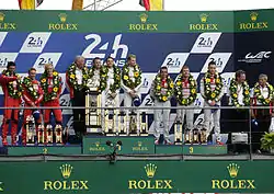 The top three finishers in all four categories appeared on the podium to collect their trophies and in a later press conference. Hülkenberg revealed that Porsche's objective was to have one car featured on the podium and was astonished over the team's first and second-place results. He said that he was proud and delighted at his team's achievement: "We had a flawless race with a great pace and we didn't make any mistake. The last lap was a bit weird because it was drizzling and people got nervous in the garage. After the finish line, it is amazing to see thousands and thousands of people cheering up."[68] Bamber stated that the win was "beyond my dreams" and hoped to return to the event in future years with Porsche.[68] Tandy described his success as "surreal":[69] "I can't think of two better people to share the car with. We haven't put a wheel wrong all race and we've just won the biggest race in the world."[72]