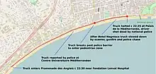 - c. 22:30 – Lahouaiej-Bouhlel turned truck eastward onto Promenade des Anglais near the Fondation Lenval Children's Hospital.[23][34][35][36]