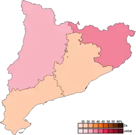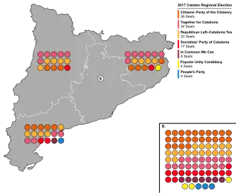 The 2017 Catalan regional election was held on Thursday 21 December 2017 to elect the 12th Parliament of the autonomous community of Catalonia. All 135 seats in the Parliament were up for election. The election was called by Spanish prime minister Mariano Rajoy after the invocation of Article 155 of the 1978 Spanish Constitution to enforce direct rule in Catalonia and the subsequent dismissal of the Catalan government under President Carles Puigdemont.[1] The three pro-Catalan independence parties won a slim majority of parliamentary seats, claiming 70 out of 135, but fell short of a majority in the popular vote by securing 47.6% of the share.