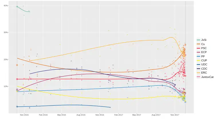 Pro-Catalan independence parties maintained their parliamentary majority at the 2015 election, although then-President Artur Mas and his Junts pel Sí (JxSí) coalition—made up primarily by Democratic Convergence of Catalonia (CDC) and Republican Left of Catalonia (ERC)—required support from the Popular Unity Candidacy (CUP) to govern. The CUP's decision to vote against Mas led to his withdrawal and to the election of Carles Puigdemont, until then mayor of Girona, as leader of a CDC–ERC coalition government.[2] Shortly thereafter, CDC was re-founded as the Catalan European Democratic Party (PDeCAT).[3]