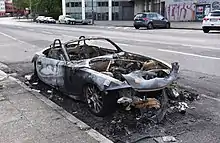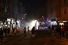 On 7 July rioters set dozens of parked cars on fire.[59] Several shops were destroyed and looted during 7 July night-time riots in the Schanzenviertel area.[60] Masked rioters and militants from the "black bloc" went uncontrolled for a period of three hours, prompting the deployment of special armed police forces to end the violence.[61]