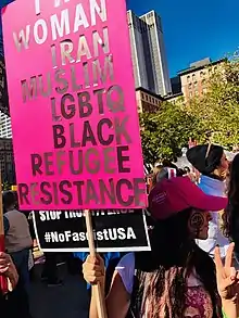 According to The New York Times, opposition to and defiance of Trump infused the protests,[54] which were sometimes directly called anti-Trump protests.[55] Organizers stated that they were "not targeting Trump specifically" and that the event was "more about being proactive about women's rights". Sarsour called it "a stand on social justice and human rights issues ranging from race, ethnicity, gender, religion, immigration and healthcare".[6][56] Wruble stated that "it's about feminism [...] But it's about more than that: It's about basic equality for all people."[57]