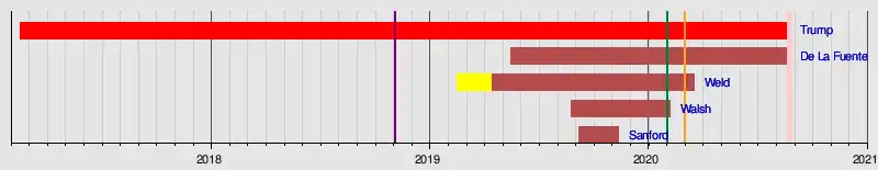 After re-enrolling as a Republican in January 2019,[29] former Republican governor of Massachusetts and 2016 Libertarian vice presidential nominee Bill Weld announced the formation of a 2020 presidential exploratory committee on February 15, 2019.[30] Weld announced his 2020 presidential candidacy on April 15, 2019.[31] Weld was considered a long-shot challenger because of Trump's popularity with Republicans; furthermore, Weld's views on abortion rights, gay marriage, marijuana legalization, and other issues conflict with socially conservative positions dominant in the modern Republican party.[32] Weld withdrew from the race on March 18, 2020, after Trump earned enough delegates to secure the nomination.[33]