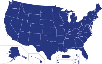 56 (AK, AL, AR, AS, AZ, CA, CO, CT, DC, DE, FL, GA, GU, HI,[51] IA,[52] ID, IL, IN, KS,[53] KY, LA,MA, MD, ME, MI, MN, MO, MP, MS, MT, NC, ND, NE, NH,[54] NJ, NM, NV,[55] NY,[56] OH, OK, OR, PA, PR, RI, SC, SD, TN, TX, UT, VA, VI, VT, WA, WI, WV, WY) |
