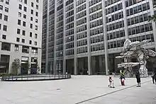 From the beginning, One Chase Manhattan Plaza had a 99% occupancy rate: the bank was on the lower stories, and 61 companies with a combined 2,500 workers were on the upper stories.[63] The tenants were mainly financial tenants such as EF Hutton[95] and Fuji Bank;[63] law firms like Cravath, Swaine & Moore;[96] and a private luncheon club called the Wall Street Club.[97] The building's address caused problems for mail delivery persons and the general public. By the early 1970s, though the names of several other buildings in Manhattan ended in the word "Plaza", One Chase Manhattan Plaza was the only such building that did not have an address designation based on a surrounding street.[98][lower-alpha 8] The "Group of Four Trees" sculpture in the plaza was installed in 1972.[61]