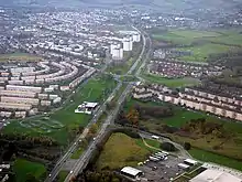 The A82 continues at the north end of the loch, along the western edge of the River Ness, which runs parallel alongside the canal towards Inverness city centre. Immediately after entering the urban area, the road crosses the canal at the Tomnahurich Swing Bridge.[58] Now inside Inverness, the road passes Queen's Park stadium and heads towards the city centre. It crosses the Ness at the Friar's Bridge, bypassing the city centre to pass through the docklands and associated industrial estates as an urban dual carriageway. The road ends at a roundabout with the A9 just south of Kessock Bridge.[57]