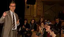 As a writer, Sorkin is recognized for his trademark fast-paced dialogue and extended monologues, complemented by frequent collaborator Thomas Schlamme's storytelling technique called the "walk and talk". These sequences consist of single tracking shots of long duration involving multiple characters engaging in conversation as they move through the set; characters enter and exit the conversation as the shot continues without any cuts. Sorkin is also known for writing memorable lines and fast-paced dialogue, such as "You can't handle the truth!" from A Few Good Men and the partly Latin tirade against God: "You get Hoynes!" in The West Wing episode "Two Cathedrals".[8] For television, one hallmark of Sorkin's writer's voice is the repartee that his characters engage in as they small talk and banter about whimsical events taking place within an episode, and interject obscure popular culture references into conversation.[155] Although his scripts are lauded for being literate,[8][15][156] Sorkin has been criticized for often turning in scripts that are overwrought.[157] His mentor William Goldman has commented that normally in visual media speeches are avoided, but that Sorkin has a talent for dialogue and gets away with breaking this rule.[38] His portrayal of women has been criticized by several commentators, with female characters in his works often subordinate, written to support the main male characters, ditzy and incompetent or ostensibly professional while still being depicted as overly emotional and needing to be rescued by men.[158][159]