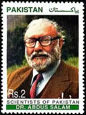 Salam was scientific advisor to the Ministry of Science and Technology in Pakistan from 1960 to 1974, a position from which he played a major and influential role in the development of the country's science infrastructure.[9][10] Salam contributed to numerous developments in theoretical and particle physics in Pakistan.[10] He was the founding director of the Space and Upper Atmosphere Research Commission (SUPARCO), and responsible for the establishment of the Theoretical Physics Group (TPG).[11][12] For this, he is viewed as the "scientific father"[5][13] of this program.[14][15][16] In 1974, Abdus Salam departed from his country in protest after the Parliament of Pakistan passed unanimously a parliamentary bill declaring members of the Ahmadiyya Muslim community, to which Salam belonged, non-Muslim.[17] In 1998, following the country's Chagai-I nuclear tests, the Government of Pakistan issued a commemorative stamp, as a part of "Scientists of Pakistan", to honour the services of Salam.[18]