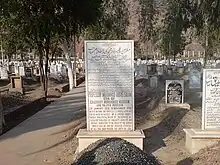 Salam was buried in Bahishti Maqbara, a cemetery established by the Ahmadiyya Community at Rabwah, Punjab, Pakistan, next to his parents' graves. The epitaph on his tomb initially read "First Muslim Nobel Laureate". The Pakistani government removed "Muslim" and left only his name on the headstone. They are the only nation to officially declare that Ahmadis are non-Muslim.[110] The word "Muslim" was initially obscured on the orders of a local magistrate before moving to the national level.[111] Under Ordinance XX of 1984,[112][113] being an Ahmadi, he was considered a non-Muslim according to the definition provided in the Second Amendment to the Constitution of Pakistan.[114]
