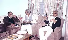 In November 1971, Salam met with Zulfikar Ali Bhutto in his residence, and following Bhutto's advice, went to the United States to avoid the Indo-Pakistani War of 1971.[78] Salam travelled to the US and returned to Pakistan with scientific literature about the Manhattan Project,[79] and calculations involving atomic bombs.[76] In 1972, the Government of Pakistan learned about the development status of the first atomic bomb completed under the Indian nuclear programme. On 20 January 1972, Salam, as Science Advisor to the President of Pakistan, managed and participated in a secret meeting of nuclear scientists with former Prime Minister, Zulfikar Ali Bhutto, in Multan, known as the 'Multan Meeting'. At this meeting Bhutto orchestrated the development of a deterrence programme.[80][81] At the meeting, only I. H. Usmani protested, believing that the country had neither the facilities or talent to carry out such an ambitious and technologically remanding project, whilst Salam remained quiet.[82] Here, Bhutto entrusted Salam and appointed Munir Khan as Chairman of PAEC, and head of the atomic bomb program, as Salam had supported Khan.[83] A few months after the meeting, Salam, Khan, and Riazuddin, met with Bhutto in his residence where the scientists briefed him about the nuclear weapons program.[84] After the meeting, Salam established the 'Theoretical Physics Group' (TPG) in PAEC. Salam led groundbreaking work at TPG until 1974.[76][85][86]