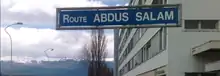 In 2015, the Academy of Young Researchers and Scholars, Lahore, renamed its library as the "Abdus Salam Library".[138] In the town of Vaughan, Ontario, Canada, near the headquarters of the Canadian branch of the Ahmadiyya Community, of which Abdus Salam was a member, the community has named a street after him, 'Abdus Salam Street',[139] while at CERN in Geneva, Switzerland there is 'Route Salam'. Additionally, there are two annual Abdus Salam science fairs, one held in Canada and the other in the US. Each is organised as a National event for young scientists from the Ahmadiyya Community in an effort to motivate youth toward scientific endeavour.[140]