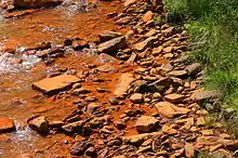When the pH of acid mine drainage is raised past 3, either through contact with fresh water or neutralizing minerals, previously soluble iron(III) ions precipitate as iron(III) hydroxide, a yellow-orange solid colloquially known as yellow boy.[12] Other types of iron precipitates are possible, including iron oxides and oxyhydroxides, and sulfates such as jarosite. All these precipitates can discolor water and smother plant and animal life on the streambed, disrupting stream ecosystems (a specific offense under the Fisheries Act in Canada). The process also produces additional hydrogen ions, which can further decrease pH. In some cases, the concentrations of iron hydroxides in yellow boy are so high, the precipitate can be recovered for commercial use in pigments.[13]
