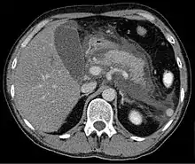 - Mortelé KJ, Mergo PJ, Taylor HM, Wiesner W, Cantisani V, Ernst MD, Kalantari BN, Ros PR (October 2004). "Peripancreatic vascular abnormalities complicating acute pancreatitis: contrast-enhanced helical CT findings". European Journal of Radiology. 52 (1): 67–72. doi:10.1016/j.ejrad.2003.10.006. PMID 15380848.
