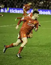 On 17 September 2015, Lallana scored the opening goal in the new UEFA Europa League season opening group stage away match against Bordeaux at the Stade Chaban-Delmas, a match Liverpool went on to draw 1–1.[51] On 1 October, Lallana scored in a second match in a row against Sion in the Europa League but the match ended in a 1–1 draw.[52] On 23 January 2016, he came on as a second-half substitute and scored an injury-time winner in Liverpool's 5–4 away win at Norwich City.[53] On 28 February 2016, Lallana came on as a second-half substitute and missed in the penalty shoot-out against Manchester City, resulting in Liverpool's defeat in the 2016 League Cup final.[54] On 3 March 2016, he scored and assisted in Liverpool's 3–0 home win against Manchester City.[55] On 23 April, he scored Liverpool's second goal against Newcastle United, which took the Reds to a 2–0 half-time lead, but the match ended with a 2–2 draw.[56] On 5 May, he scored the third goal in Liverpool's second-leg win over Spanish team Villarreal in the Europa League semi-finals, with the Reds advancing to the final with a 3–1 aggregate win.[57]