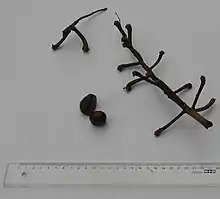 Aesculus hippocastanum is a large tree, growing to about 39 metres (128 ft) tall[9] with a domed crown of stout branches. On old trees, the outer branches are often pendulous with curled-up tips. The leaves are opposite and palmately compound, with 5–7 leaflets 13–30 cm (5–12 in) long, making the whole leaf up to 60 cm (24 in) across, with a 7–20 cm (3–8 in) petiole. The leaf scars left on twigs after the leaves have fallen have a distinctive horseshoe shape, complete with seven "nails". The flowers are usually white with a yellow to pink blotch at the base of the petals;[9] they are produced in spring in erect panicles 10–30 cm (4–12 in) tall with about 20–50 flowers on each panicle. Its pollen is not poisonous for honey bees.[10] Usually only 1–5 fruits develop on each panicle. The shell is a green, spiky capsule containing one (rarely two or three) nut-like seeds called conkers or horse-chestnuts. Each conker is 2–4 cm (3⁄4–1+1⁄2 in) in diameter, glossy nut-brown with a whitish scar at the base.[11]