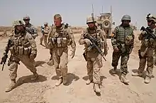 According to Pakistani Afghanistan expert Ahmed Rashid, "between 1994 and 1999, an estimated 80,000 to 100,000 Pakistanis trained and fought in Afghanistan" on the side of the Taliban.[95] Peter Tomsen stated that Pakistani military and ISI officers along with thousands of regular Pakistani Armed Forces personnel had been involved in the fighting in Afghanistan.[96] In 2001 alone, according to several international sources, 28,000–30,000 Pakistani nationals, 14,000–15,000 Afghan Taliban and 2,000–3,000 Al Qaeda militants were fighting against anti-Taliban forces in Afghanistan as a roughly 45,000-strong military force.[67][78][97][98] Pakistani President Pervez Musharraf – then as Chief of Army Staff – was responsible for sending thousands of Pakistanis to fight alongside the Taliban and Bin Laden against the forces of Massoud.[67][68][99] Of the estimated 28,000 Pakistani nationals fighting in Afghanistan, 8,000 were militants recruited in madrassas filling regular Taliban ranks.[78] A 1998 document by the U.S. State Department confirms that "20–40 percent of [regular] Taliban soldiers are Pakistani."[68] The document further states that the parents of those Pakistani nationals "know nothing regarding their child's military involvement with the Taliban until their bodies are brought back to Pakistan."[68] According to the U.S. State Department report and reports by Human Rights Watch, the other Pakistani nationals fighting in Afghanistan were regular Pakistani soldiers especially from the Frontier Corps but also from the Pakistani Army providing direct combat support.[68][100]