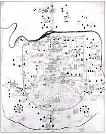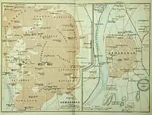 The area around Ahmedabad has been inhabited since the 11th century, when it was known as Ashaval.[32] At that time, Karna, the Chaulukya (Solanki) ruler of Anhilwara (modern Patan), waged a successful war against the Bhil king of Ashaval,[33] and established a city called Karnavati on the banks of the Sabarmati.[31] Solanki rule lasted until the 13th century, when Gujarat came under the control of the Vaghela dynasty of Dholka. Gujarat subsequently came under the control of the Delhi Sultanate in the 14th century. However, by the earlier 15th century, the local Muslim governor Zafar Khan Muzaffar established his independence from the Delhi Sultanate and crowned himself Sultan of Gujarat as Muzaffar Shah I, thereby founding the Muzaffarid dynasty.[34][35][36] In 1411, the area came under the control of his grandson, Sultan Ahmed Shah, who selected the forested area along the banks of the Sabarmati river for his new capital. He laid the foundation of a new walled city near Karnavati and named it Ahmedabad after himself.[37][38] According to other versions, he named the city after four Muslim saints in the area who all had the name Ahmed.[39] Ahmed Shah I laid the foundation of the city on 26 February 1411[40] (at 1.20 pm, Thursday, the second day of Dhu al-Qi'dah, Hijri year 813[41]) at Manek Burj. Manek Burj is named after the legendary 15th-century Hindu saint, Maneknath, who intervened to help Ahmed Shah I build Bhadra Fort in 1411.[37][42][43][44] He chose it as the new capital on 4 March 1411.[45] Chandan and Rajesh Nath, 13th generation descendants of Saint Maneknath, perform puja and hoist the flag on Manek Burj on Ahmedabad's foundation day and for the Vijayadashami festival every year.[37][43][46][47]