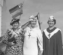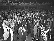 McPherson's political alignment was undisclosed. She endorsed Herbert Hoover, but threw her support behind Franklin D. Roosevelt and his social programs after his election.[87] She patronized organized labor, preaching that a gangster's money was "no more unclean than the dollars of the man who amasses his millions from underpaid factory workers".[88] She was more cautious when labor strikes resulted in violent uprisings, and worried about Communism's influence in labor unions. McPherson opposed both Communism and fascism as totalitarian rule; Communism ruling without God and fascism wrongly stating to represent the power of God.[89]