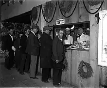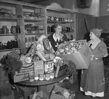 Drawing from her childhood experience with the Salvation Army, in 1927 McPherson opened a commissary at Angelus Temple offering food, clothing, and blankets. She became active in creating soup kitchens, free clinics, and other charitable activities during the Great Depression, and fed an estimated 1.5 million. Volunteer workers filled commissary baskets with food and other items, as well as Foursquare Gospel literature.[55] When the government shut down the free school-lunch program, McPherson took it over. Her giving "alleviated suffering on an epic scale".[56]