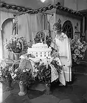 For several years, she traveled and raised money for the construction of a large, domed church in the Echo Park area of Los Angeles, named Angelus Temple, in reference to the Angelus bell and to angels.[37] Not wanting to incur debt, McPherson found a construction firm willing to work with her as funds were raised "by faith",[38] beginning with $5,000 for the foundation.[39] McPherson mobilized diverse groups to fund and build the church, by means such as selling chairs for Temple seating.[40][41] In his book 'Growing up in Hollywood' Robert Parrish describes in detail attending one of her services.[42]