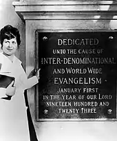 Aimee Elizabeth Semple McPherson (née Kennedy; October 9, 1890 – September 27, 1944), also known as Sister Aimee or Sister, was a Canadian Pentecostal evangelist and media celebrity in the 1920s and 1930s,[1] famous for founding the Foursquare Church. McPherson pioneered the use of broadcast mass media for wider dissemination of both religious services and appeals for donations, using radio to draw in both additional audience and revenue with the growing appeal of popular entertainment and incorporating stage techniques into her weekly sermons at Angelus Temple, an early megachurch.[2]