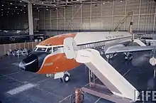 Under John F. Kennedy, presidential air travel entered the jet age.[36] Although he could use the Eisenhower-era jets for trips to Canada, France, Austria, and the United Kingdom, when he came into office, his primary aircraft domestically was still a prop powered Douglas VC-118A Liftmaster.[37] In October 1962, the modified long-range Boeing VC-137C Stratoliner SAM 26000, featuring livery designed by Loewy would be delivered, and immediately became an important element of the Kennedy administration's brand.[29]
