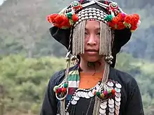 "Ulo Akha headdress consists of a bamboo cone, covered in beads, silver studs and seeds, edged in coins (silver rupees for the rich, baht for the poor) topped by several dangling chicken feather tassels and maybe a woolen pom-pom. The Pamee Akha wear a trapezoidal colt cap covered in silver studs with coins on the beaded side flaps and long chains of linked silver rings hanging down each side. The Lomi Akha wear a round cap covered in silver studs and framed by silver balls, coins and pendants and the married women attach a trapezoidal inscribed plate at the back."[20]