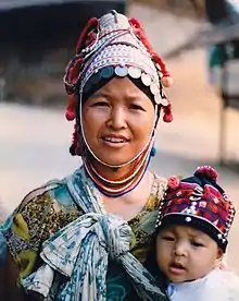 The Akha are often classified by the Chinese government as part of the Hani, an official national minority. The Akha are closely related to the Hani, but consider themselves a distinct group and often resist being subsumed under that identity.[9] In Thailand, they are classified as one of the six hill tribes, a term used for all of the various tribal peoples who migrated from China and Tibet over the past few centuries and who now inhabit the dense forests on the borders between Thailand, Laos, and Burma. Few Akha in Thailand are citizens and most are registered as aliens. There is an oft cited lack of political or state infrastructure to address Akha, or any other indigenous issues in Thailand.[7]
