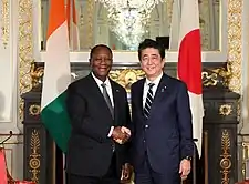 Alasane Dramane Ouattara (ⓘ; French pronunciation: [alasan wataʁa]; born 1 January 1942) is an Ivorian politician who has been President of Ivory Coast (Côte d'Ivoire) since 2010. An economist by profession, Ouattara worked for the International Monetary Fund (IMF)[1] and the Central Bank of West African States (French: Banque Centrale des Etats de l'Afrique de l'Ouest, BCEAO), and he was the Prime Minister of Côte d'Ivoire from November 1990 to December 1993, appointed to that post by President Félix Houphouët-Boigny.[2][3][4][5] Ouattara became the President of the Rally of the Republicans (RDR), an Ivorian political party, in 1999.