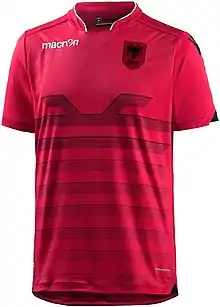 Albania' colours are red and black, mirroring the nation's flag. The team typically wears red shirts, black shorts and red socks. Away kits are usually all-white, with red and black trim. In the 2000s, Albania signed with German sportswear company Puma and was the first kit supplier of Albania in the 21st century. On 29 January 2016, Albania signed Italian sportswear company Macron, which continues to be Albania's kit.[34]