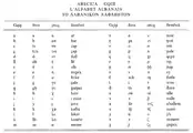 | Α | Β | B | Ϳ | Γ | Γ̇ | Γ̇ϳ | Δ | D | Ε | Ε̱ | Ζ | Θ | Ι | Κ | Κϳ | Λ | Λϳ | Μ | Ν | Ν̇ | Νϳ | Ξ | Ο | Π | Ρ | Σ | Σ̇ | Σ̈ | Τ | Υ | Φ | Χ̇ | Χ |