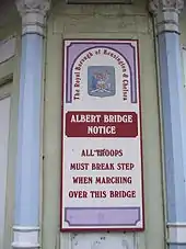 - The original sign at each end of the Albert Bridge read: "Officers in command of troops are requested to break step when passing over this bridge", which can be seen in the newsreel issued by British Pathe on 24 May 1954.[20]